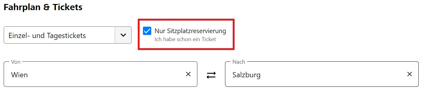 Sur le site d’ÖBB, pour réserver une place, sélectionnez l’option :« Nur Sitzplatzreservierung – Ich habe schon ein Ticket »(« Réservation de siège uniquement – Je possède déjà un billet »).